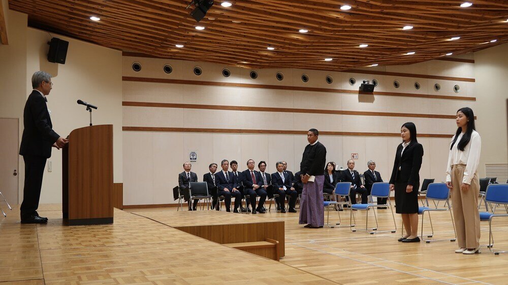 令和7年10月2日(木)、宮崎大学創立330記念交流会館コンベンションホールにおいて、秋季入学式を挙行し、工学研究科修士課程2名、農学研究科修士課程1名、農学工学総合研究科博士後期課程1名の計4名の外国人留学生が入学しました。(アフガニスタン1名、ミャンマー3名)