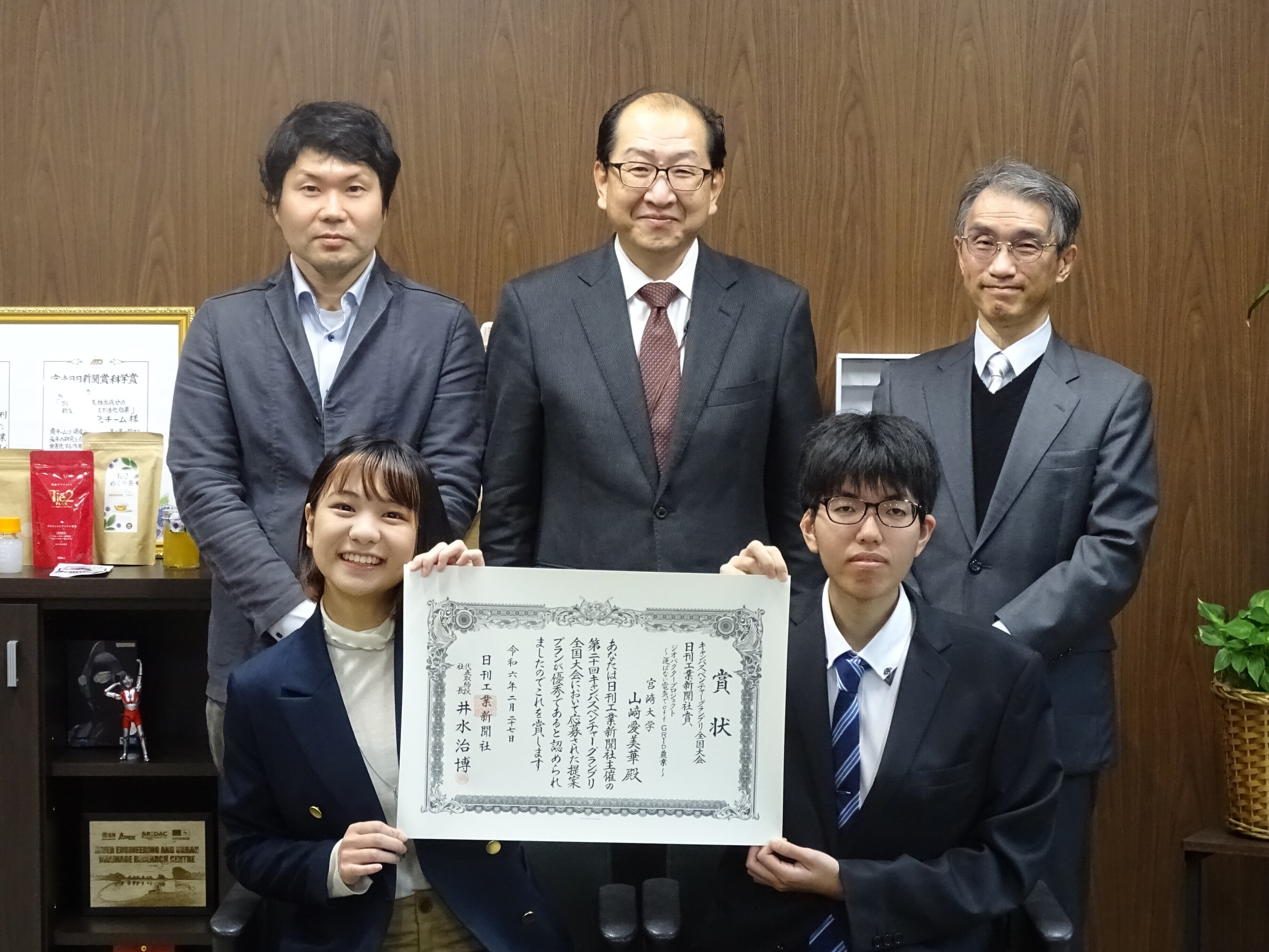 農学部4年の林田幸大さんと工学部4年の星崎圭亮さんが「宮崎・学生ビジネスプランコンテスト」のグランプリ受賞を國武久登農学部長に報告しました