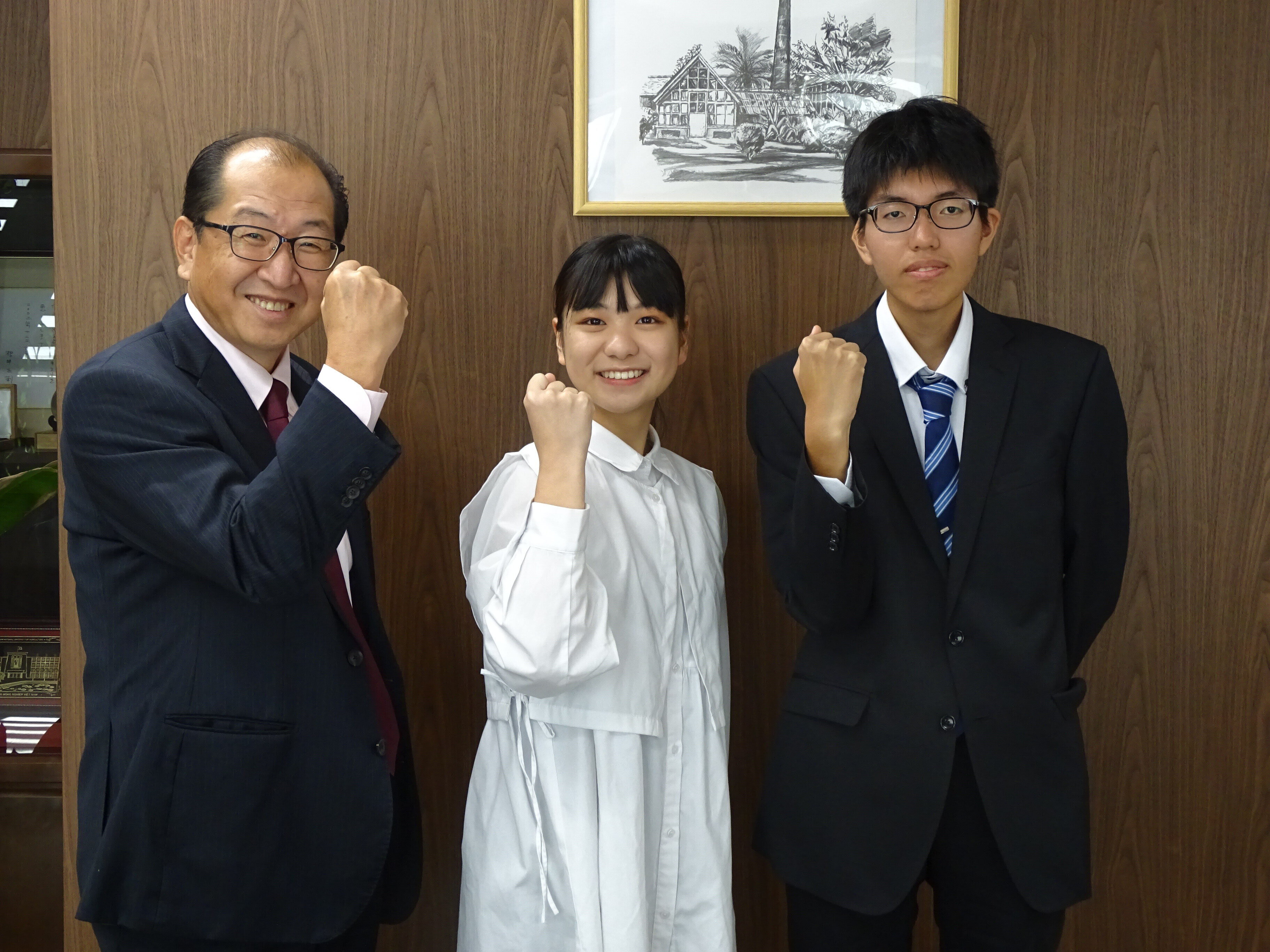 畜産草地科学科2年の藤井琴未さんが鮫島浩学長に「第16回全日本大学対抗ミートジャッジング競技会」の受賞報告を行いました