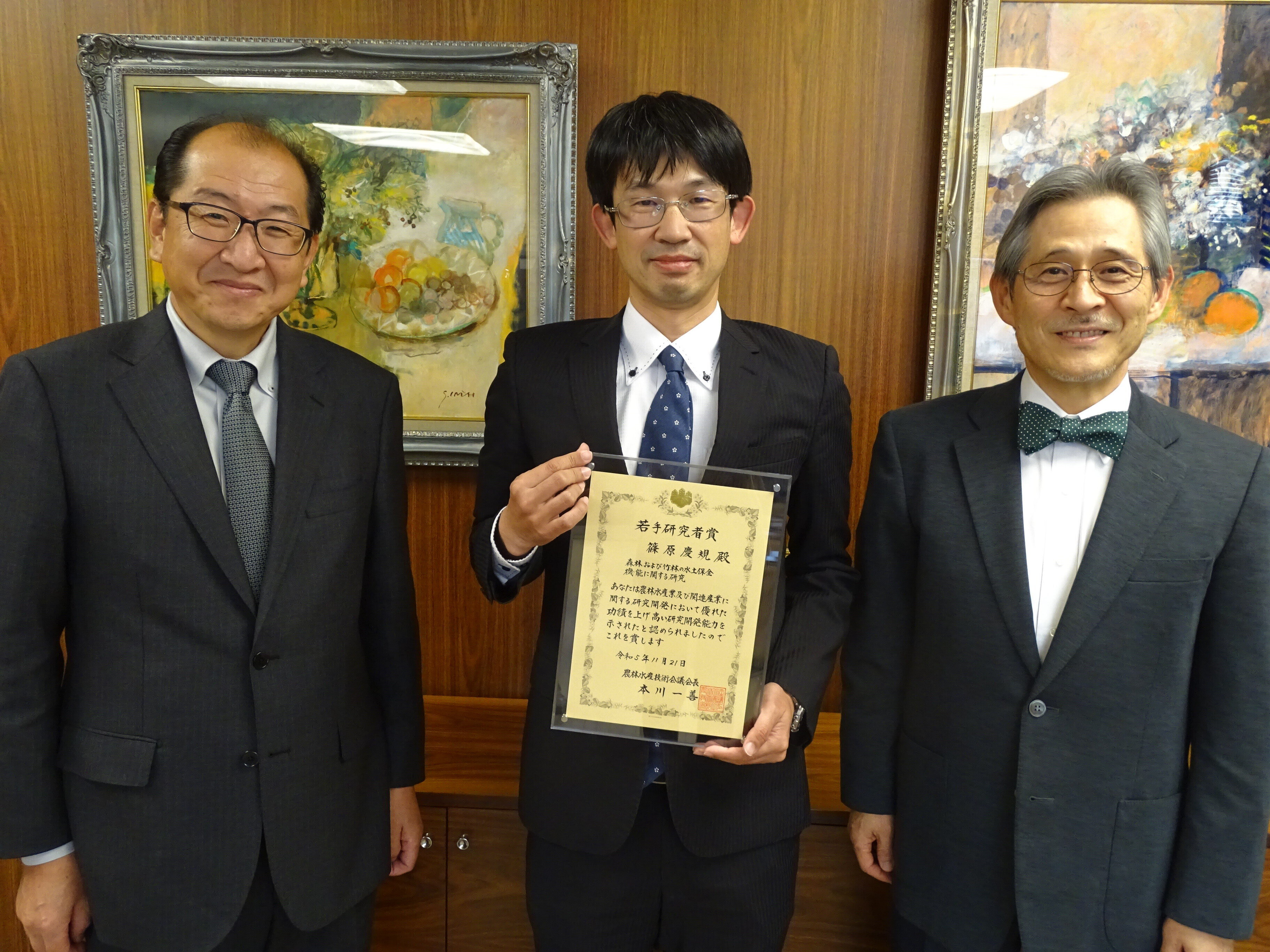 森林緑地環境科学科の篠原慶規准教授が鮫島浩学長へ受賞報告を行いました