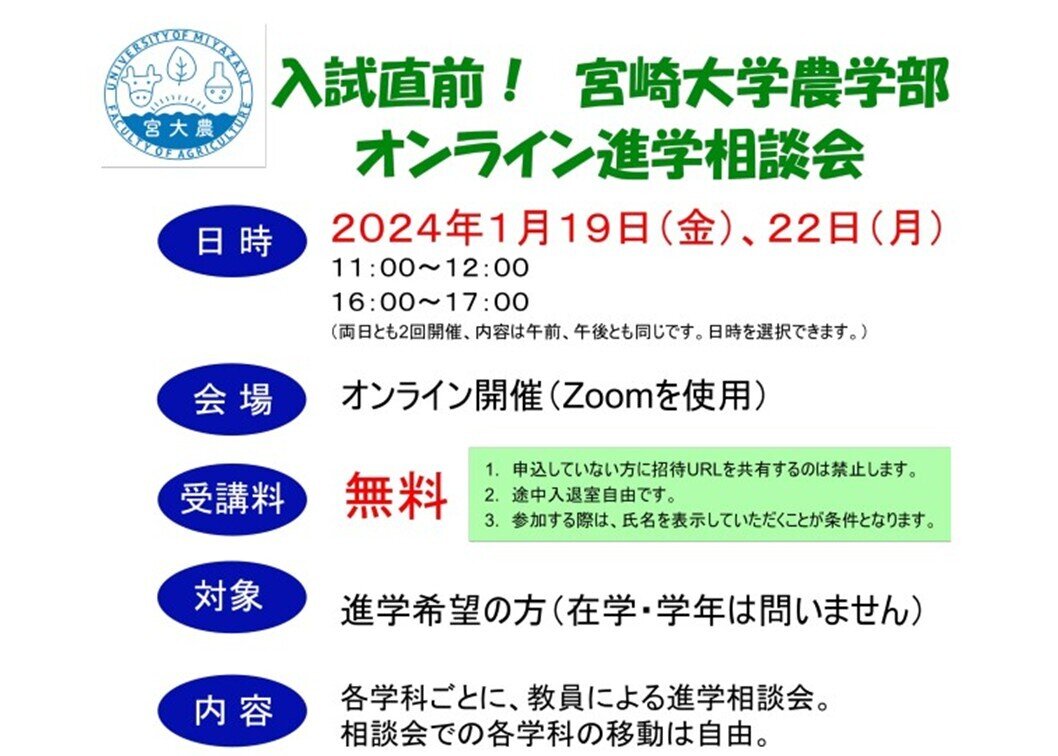 令和7年度(2025年度)宮崎大学大学院農学研究科(修士課程)1次募集 一般選抜の面接日程について
