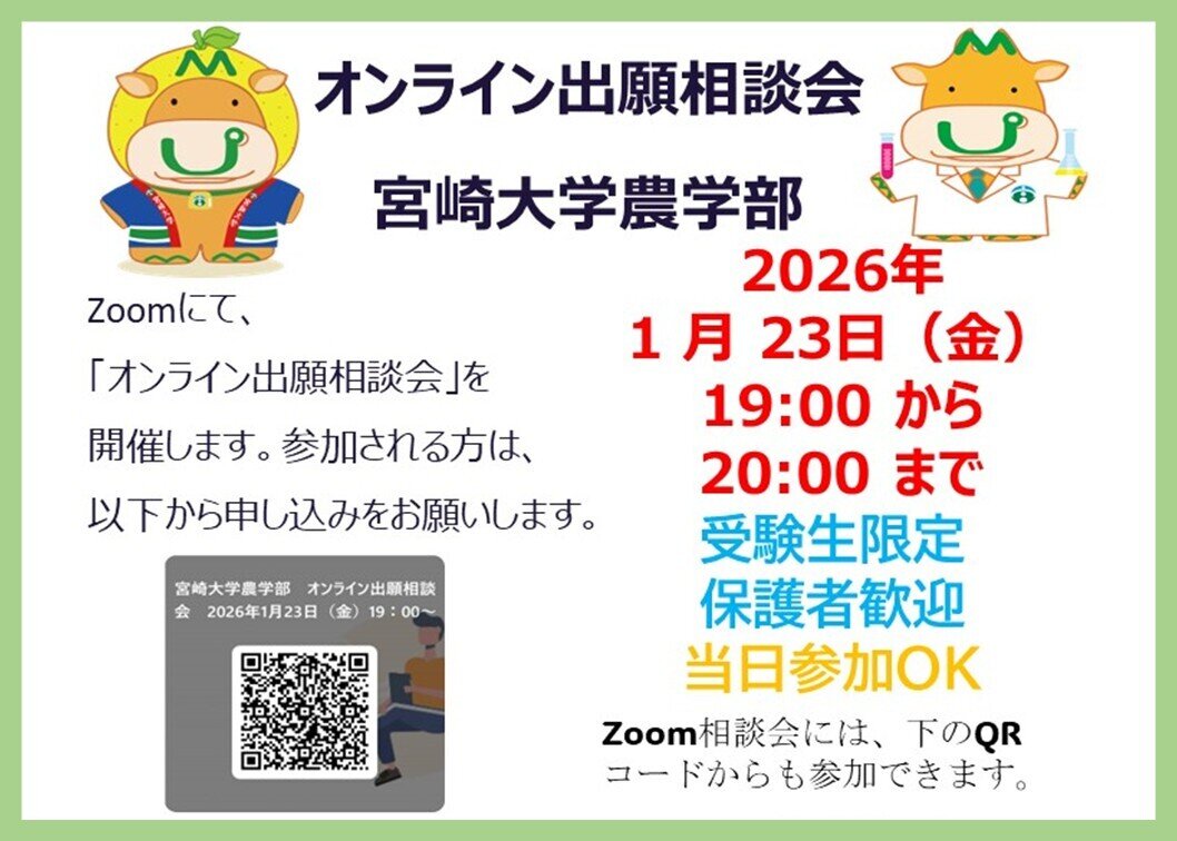 令和8年1月23日に宮崎大学農学部 オンライン出願相談会(Zoom)を実施します。