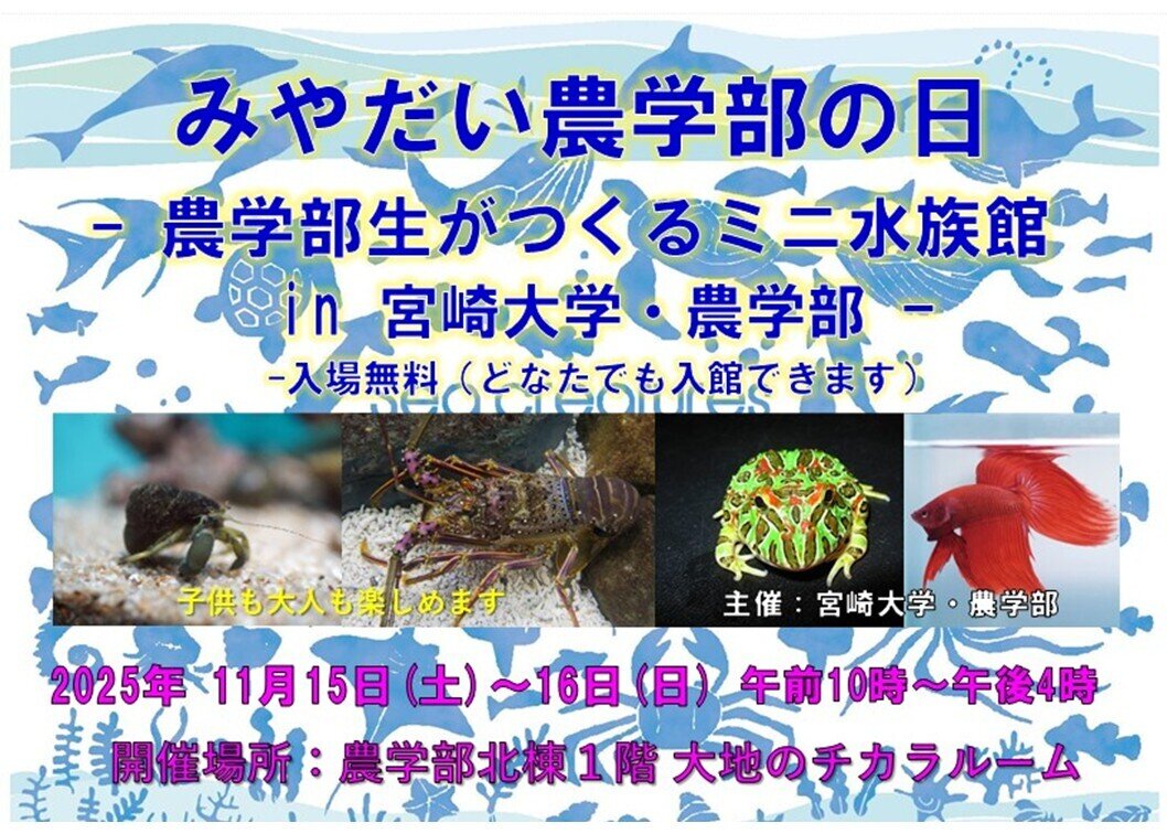 11月15・16日開催「みやだい農学部の日ー農学部生がつくるミニ水族館 in 宮崎大学・農学部ー」についてのご案内