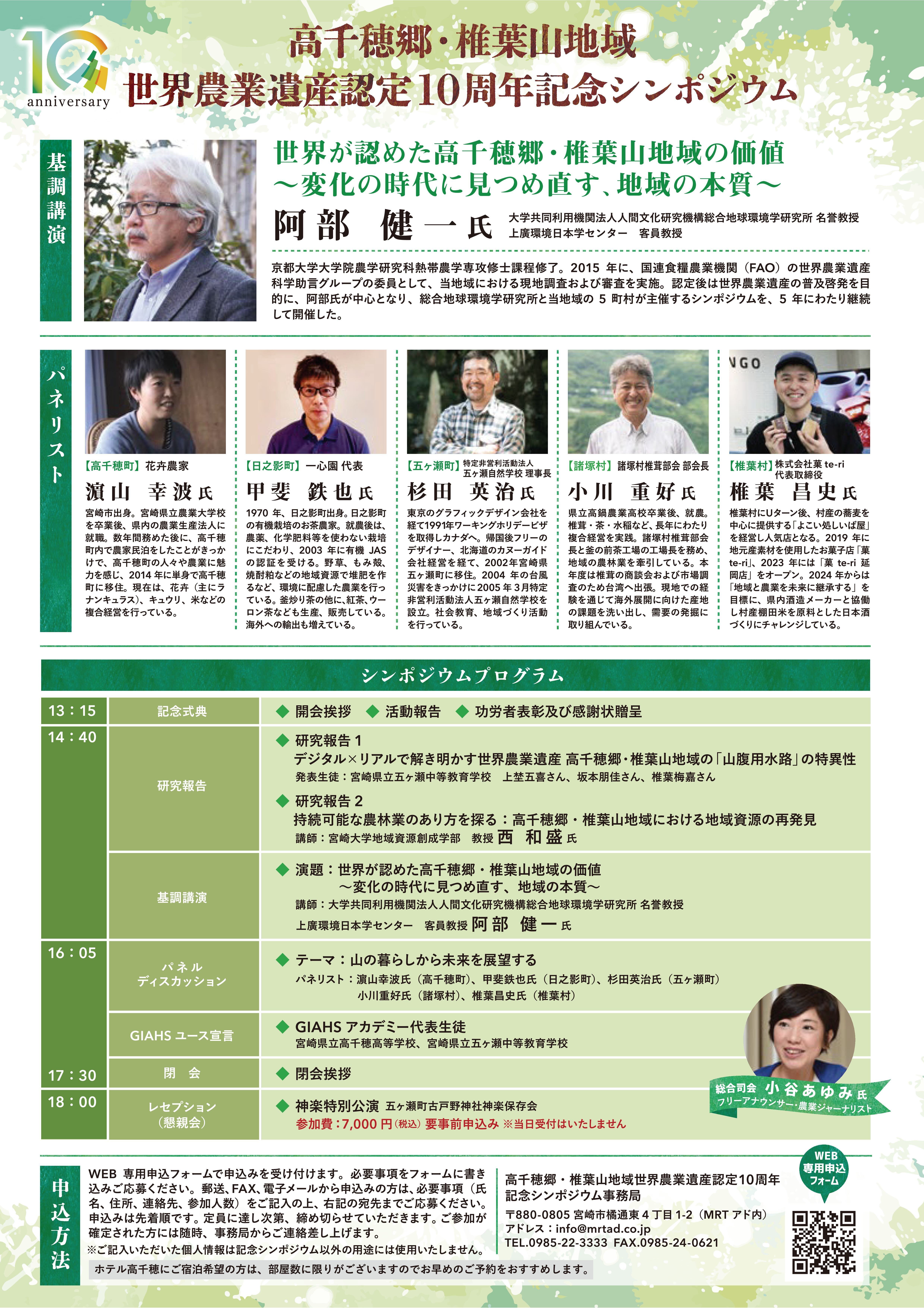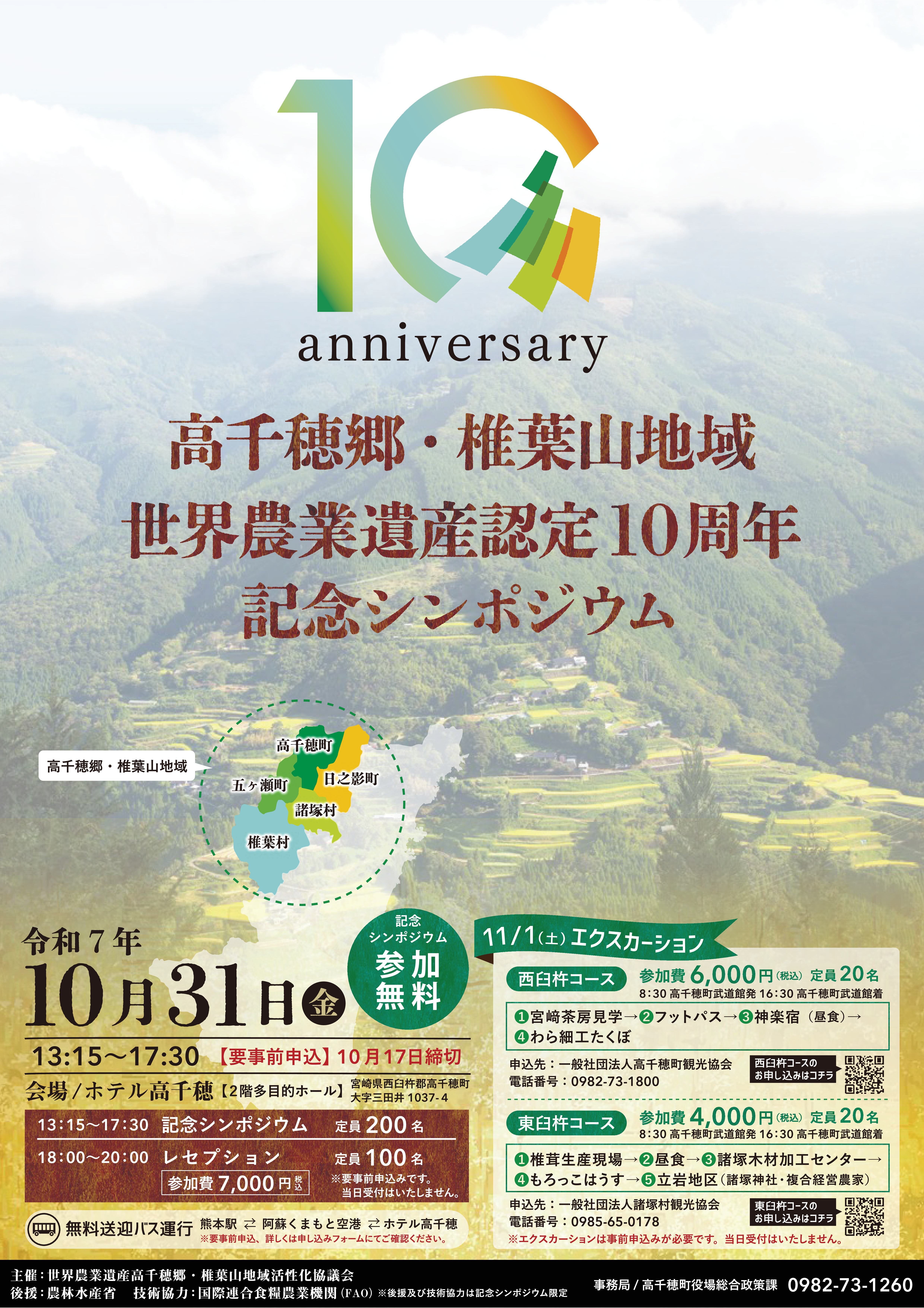 令和7年10月31日(金)、ホテル高千穂において、「高千穂郷・椎葉三地域 世界農業遺産認定10周年 記念シンポジウム」が開催されます。