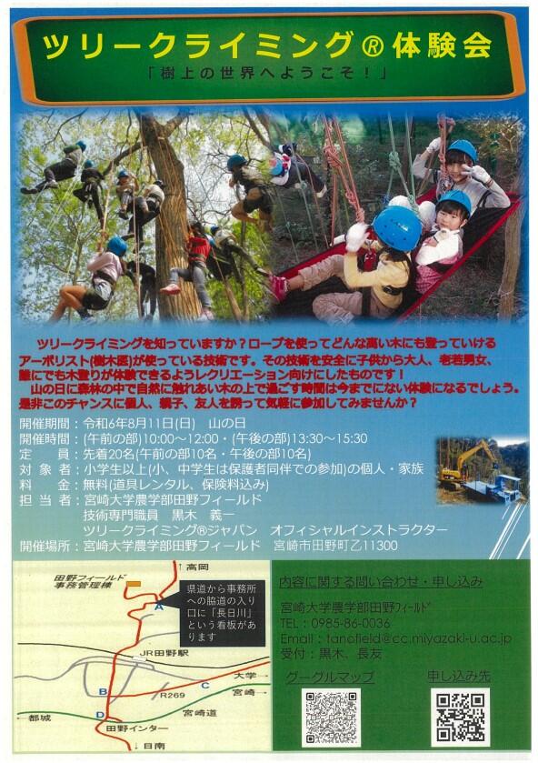8/11(日)は山の日なので「山に行こう!森林に触れよう!」という企画でツリークライミング@体験会を田野フィールドにて開催します。