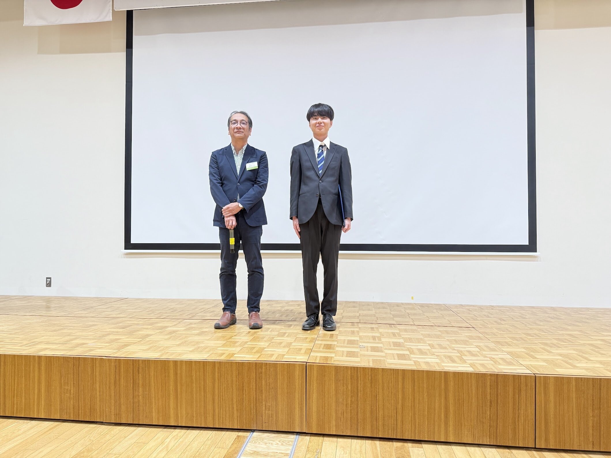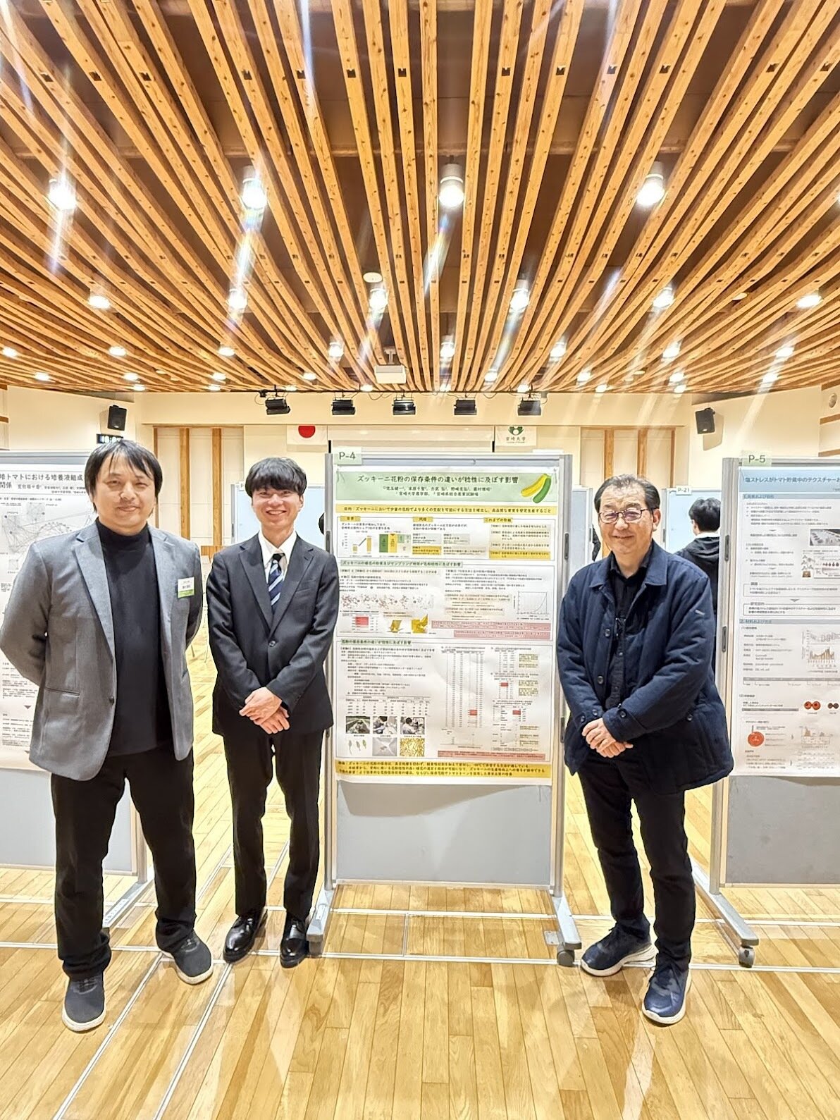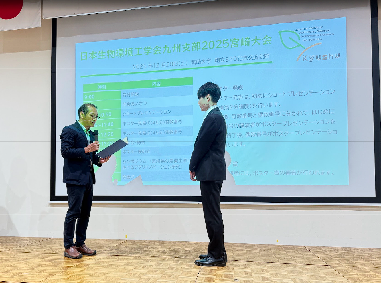 2025年12月24日 学生の活躍研究成果 施設園芸学研究室(霧村研究室)4年生の児玉健一さんがベストポスター賞を受賞しました 2025年12月20日(土)に開催された日本生物環境工学会九州支部2025年宮崎大会において,施設園芸学研究室(霧村研究室)4年生の児玉健一さんがベストポスター賞を受賞しました. 受賞発表題目 ズッキーニの花粉の保存条件の違いが稔性に及ぼす影響 ○児玉健一¹,末原千聖²,力武 弘²,野崎克弘²,霧村雅昭¹ (¹宮崎大学農学部,²宮崎県総合農業試験場) 本研究は,宮崎県の農業現場が抱える課題に対し,宮崎県総合農業試験場野菜部の皆さまと連携して取り組んだ成果です. 現場に近いテーマ設定と,丁寧な実験・考察が高く評価されました. 今後のさらなる活躍が期待されます. 一覧に戻る