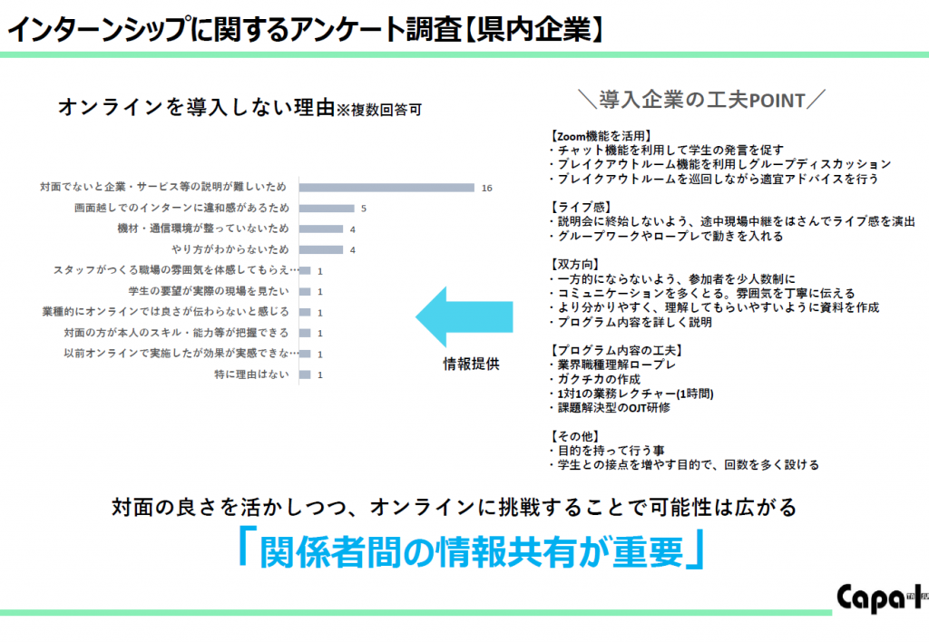 ■目的:コロナ禍における本県の産業人材の確保・育成を議論するための参考データとして、オンラインや対面でのインターンシップ実施状況等を把握。受入側である企業等と送り手側である高等教育機関で現状と課題を共有し、今後のあり方を分析できる情報を収集するため。