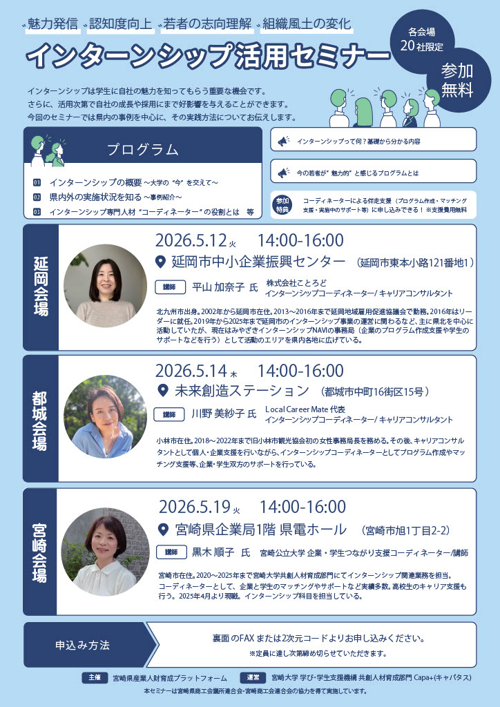 Capa+キャパタスでは毎年、県内各地にお邪魔して企業向けにインターンシップの基本を学ぶセミナーを開催しています。現地で活動するコーディネーターが地域の特色を活かした受入ノウハウやその効果などについて詳しくお伝えします!