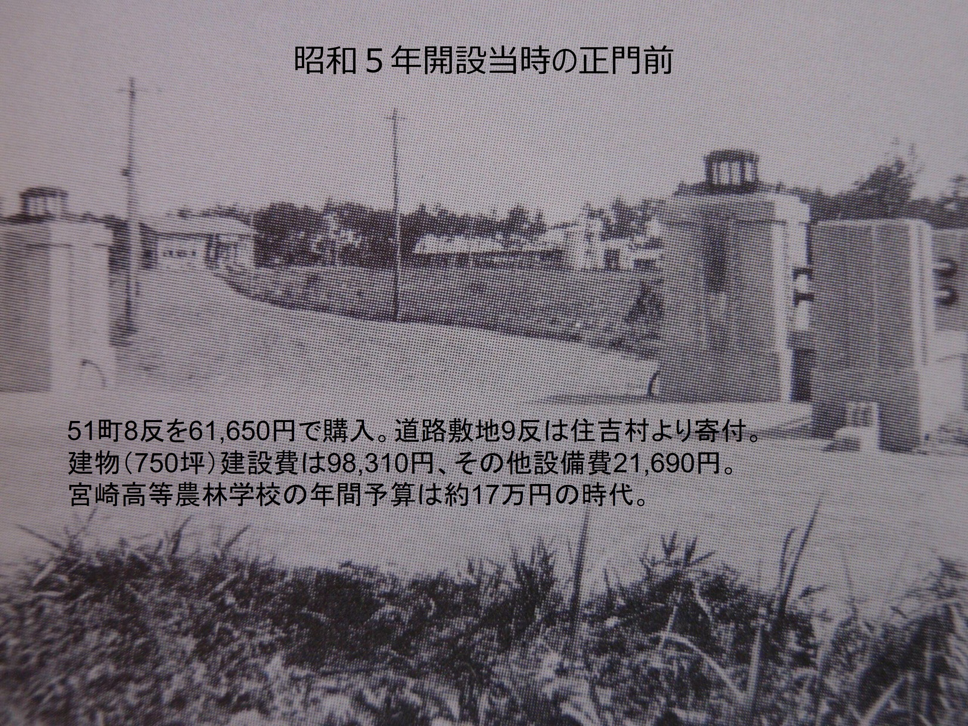 工事開始。51町8反を61,650円で購入。道路敷地9反は住吉村より寄付。建物(750坪)建設費は98,310円、その他設備費21,690円。宮崎高等農林学校の年間予算は約17万円の時代。 |