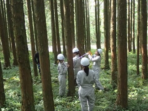 学生たちは初めての毎木調査ということで、普段は見慣れない調査用具にとまどいながら、調査を行っていました。ただ、田野演習林の職員と熊本県立大学のTAや先生が調査を行っていく過程で、指導を受けていくうちにスムーズのこなせるようになっていきました。