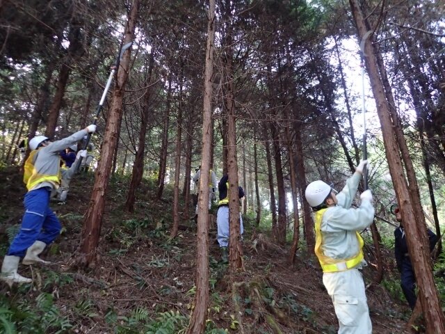 今年も2回目の南九州大学の施業体験実習として12月4日に,枝打ちと間伐を体験してもらいました。約20年生のヒノキ林です。間伐は手鋸とチェーンソーの両方を試してもらいましたが,ヒノキということもあり(スギに比べて硬い)手鋸は皆さん難儀していました。枝打ちはレガシーです。数十年後に枝打ちをした無節材が評価が高くなっていることを祈るばかりです。この実習で林業にも興味を持ってもらえると幸いです。