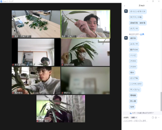 1日目はあらかじめ送付した葉サンプルを用いて同定の実習を行いました。常緑広葉樹だからこそ可能な方法です。チャットで種名を正確に伝えられるのは利点です。一方あえてサンプルは個体識別せずに送付したので,そのサンプルが本当に今,説明されているその種なのかは分かりにくいものもあったようです。