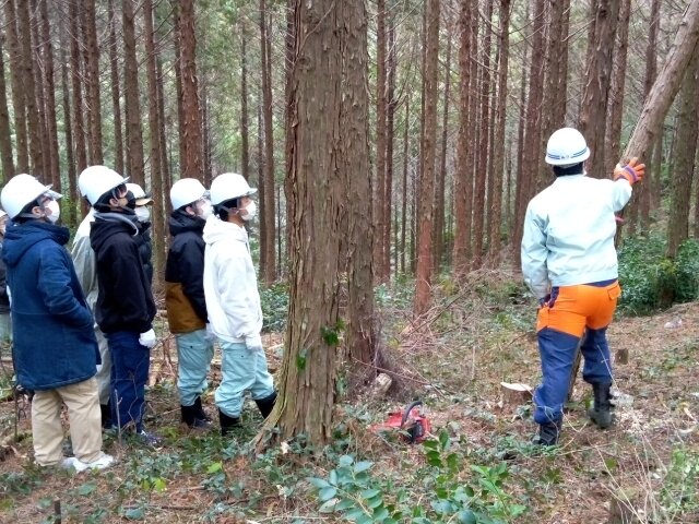 こちらも毎年恒例の南九州大学の施業体験の実習です。今回は1月初めになってしまったので例年より少ない人数でした。枝打ちと間伐です。ヒノキの間伐は倒れないので手間がかかります。やはりスギのようにチェーンソーで切れた瞬間にバタンと倒れてくれると達成感があるのですが。