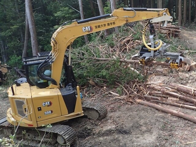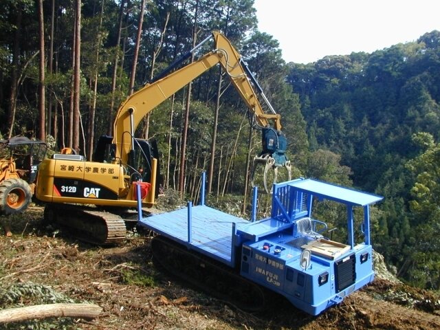 フェラーバンチャ(ザウルスロボ):立木を挟んでハサミで切断し,そのまま立木を取り回すことができる自走式重機。