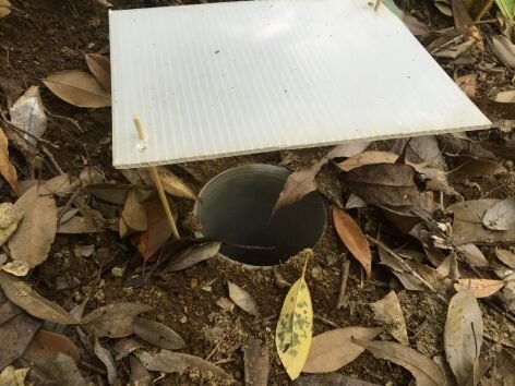 ピットホールトラップ法は林床にポリプロピレンの容器を埋設し、そこに落ちた動物を採取する方法です。