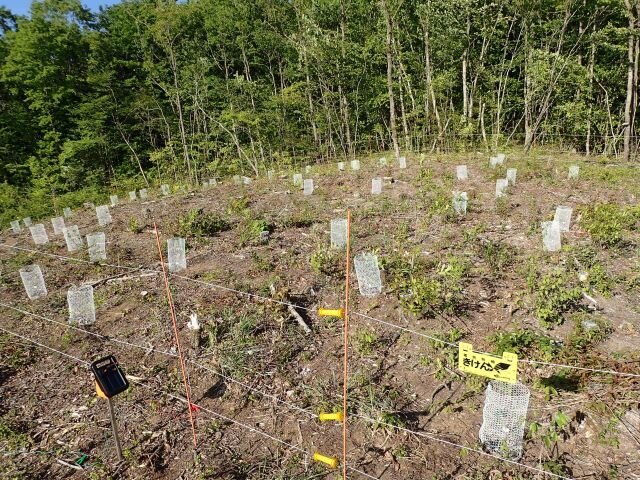 東京大学後藤先生主宰のダケカンバの相互移植実験です。日本国内のダケカンバの自生地12か所から種子を採取し,発芽した苗を国内12か所に植栽することにより,地域による気候の違いを温暖化の影響と読み替えて評価する実験です。