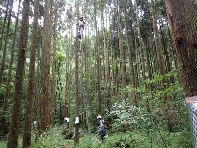 神戸大学石井先生主宰のスギ幹温暖化実験です。線状ヒーターを幹に巻き付け,肥大成長や導水性の変化の品種間差をみます。トラブル続きだったのですが設置後半年してやっと通常運用にいたりました。マニュアルがあるわけではないのでしょうがないです。写真は幹上部にもセンサーを設置しているところです。作業している技術職員はツリークライマーです。