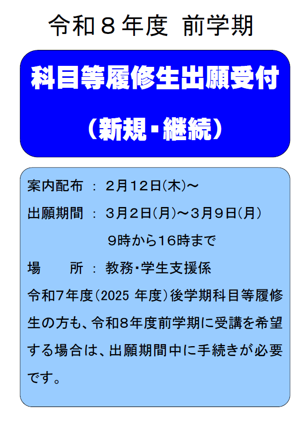 令和8年度(前学期)科目等履修生の募集について
