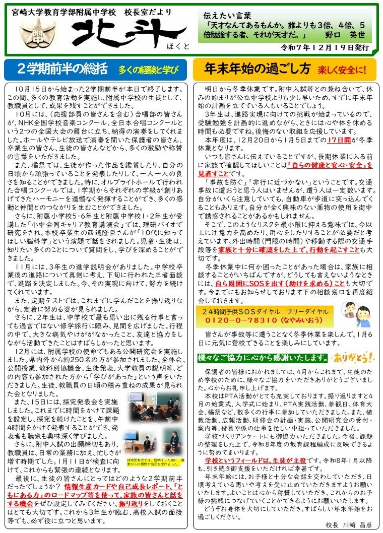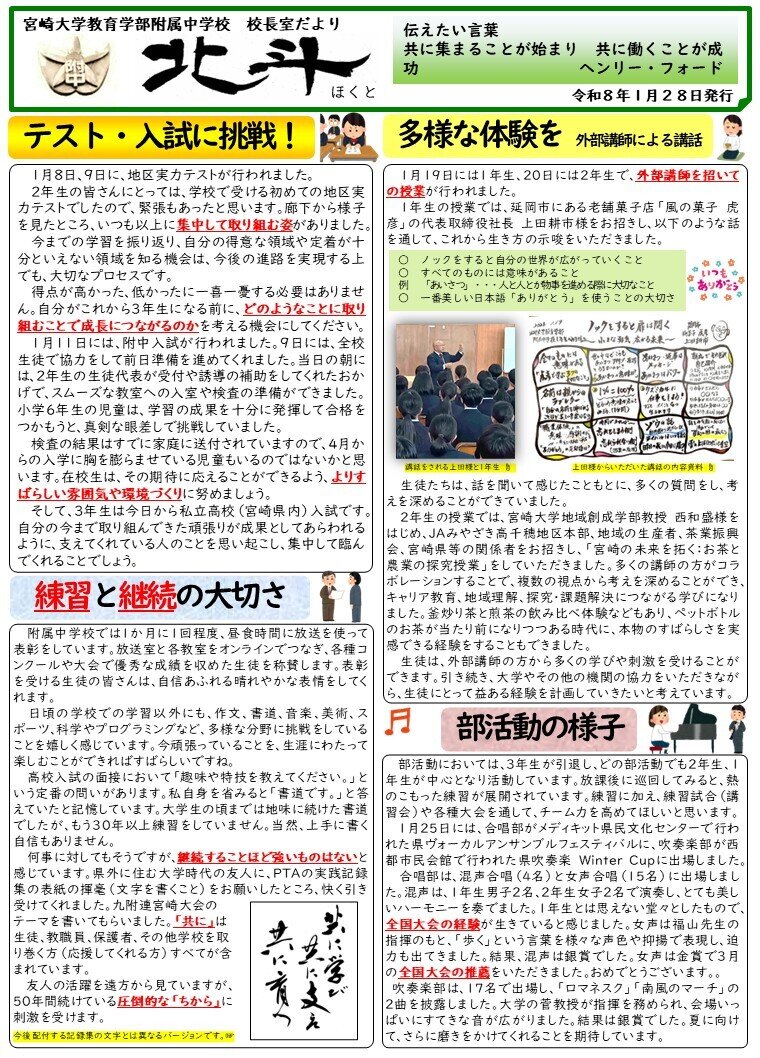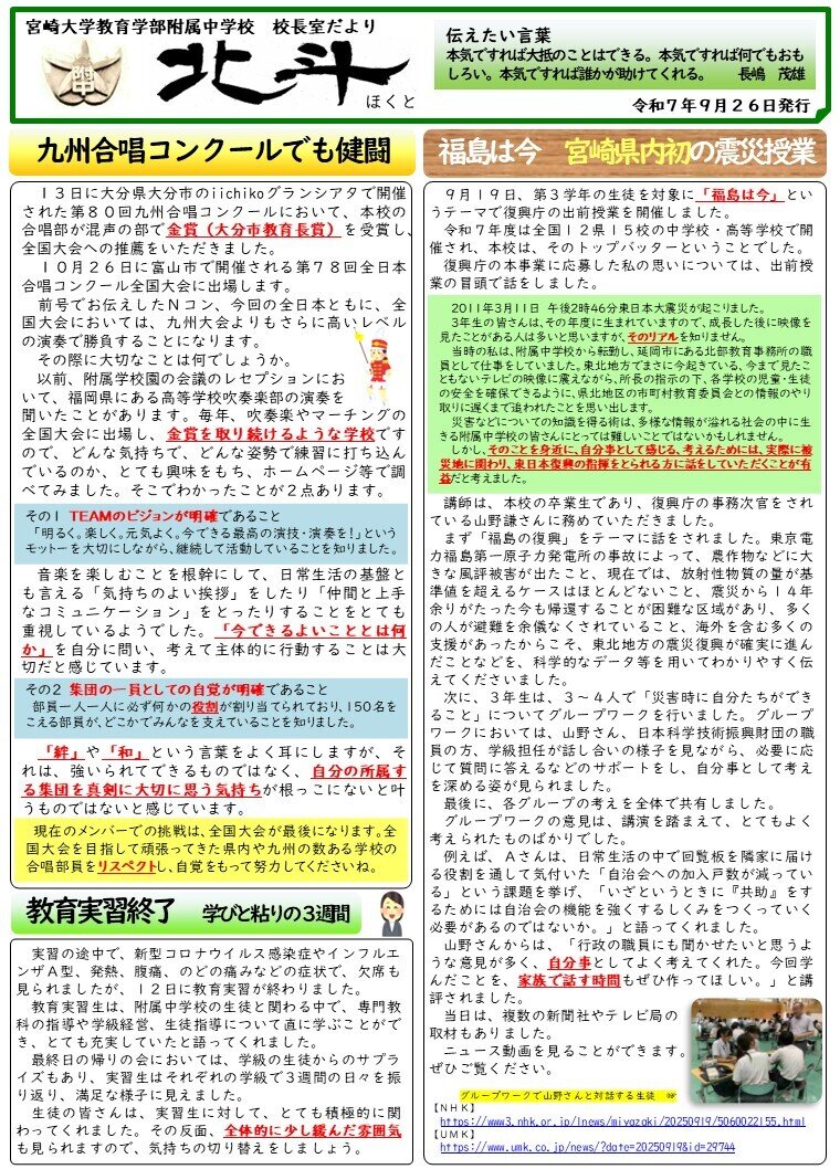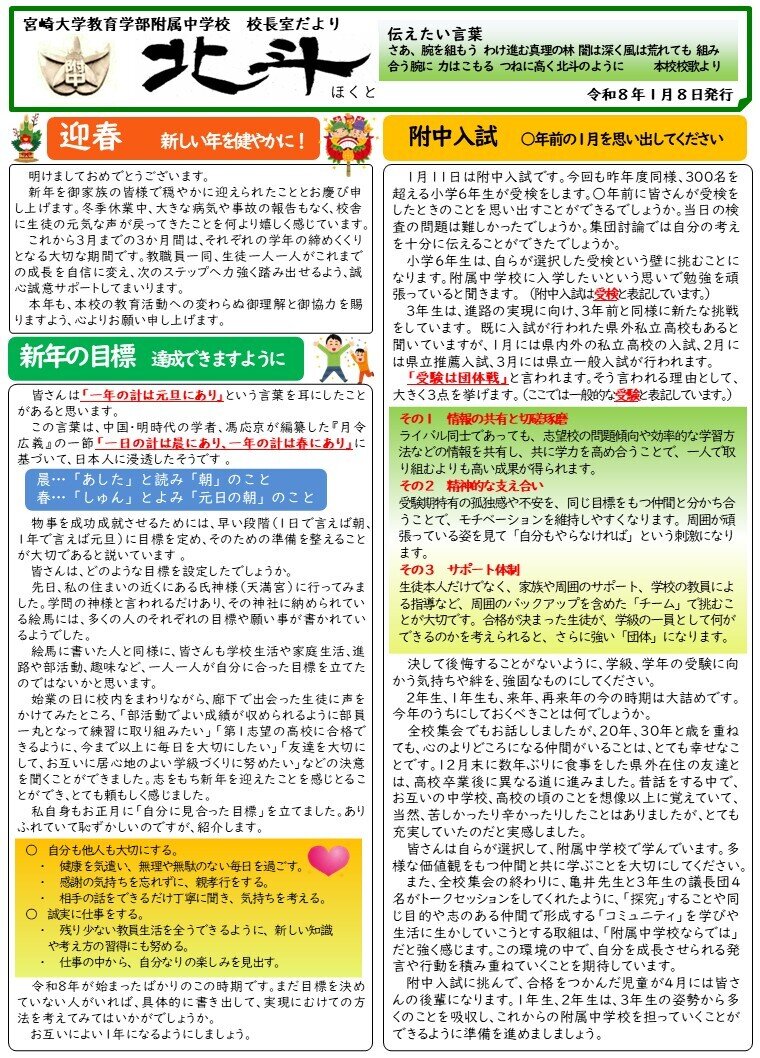 本校は、宮崎師範学校の附属中学校として昭和22年に創設され、本年度78年目を迎える歴史と伝統のある学校です。この間、13,307名の方々が、この学舎を卒業され、県内はもとより国内外の各界、各方面で活躍されています。 令和7年度は、146名の新1年生を迎え、14学級(特別支援学級2学級を含む)、439名の生徒たちとともに、スタートいたしました。