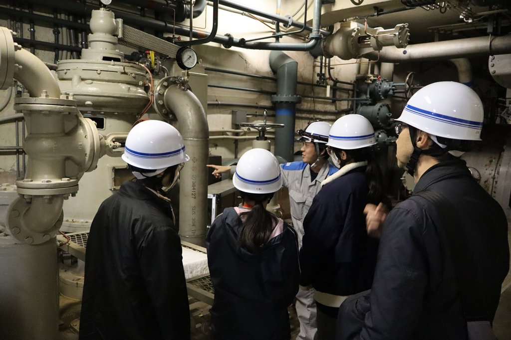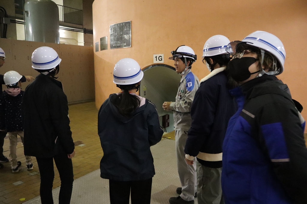 ダム見学後は一ツ瀬発電所へ移動し、社員の方の案内の元、巨大なタービンや油圧機など、実際の発電設備を見学しました。発電所内の広大な地下空間を歩くことで、電力を安定的に供給するための工夫や技術に触れることができました。