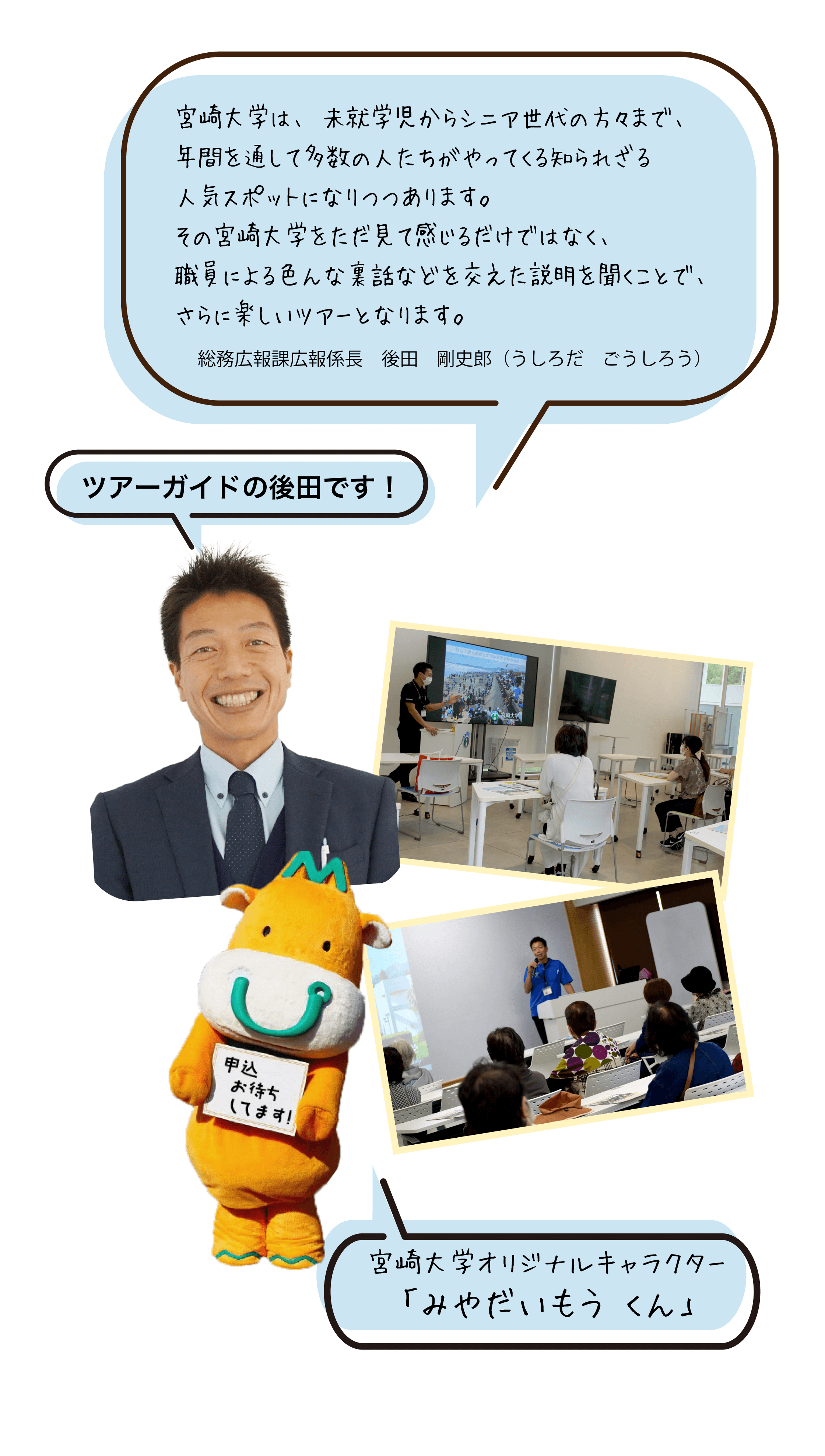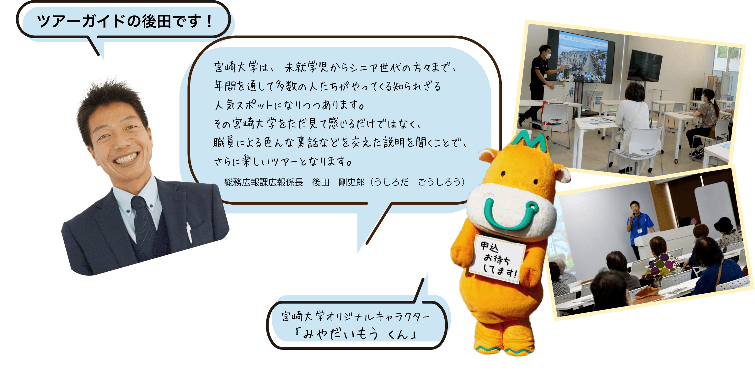 宮崎大学を大学職員がご案内いたします。学内をいろいろと散策しながら、見て・聞いて・知ってもらえるコースです。
