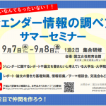 2023年6月27日 / 最終更新日時 : 2023年6月27日 清花アテナスタッフ お知らせ 【セミナー案内】「知らないなんてもったいない!ジェンダー情報の調べ方 サマーセミナー」開催のご案内 独立行政法人国立女性教育会館より、下記セミナーの案内が届きましたので、お知らせいたします。参加申し込み締め切りは7/20です。興味を持たれた大学生・大学院生は早めにお申し込みください。 ジェンダー平等な未来をつくるには、 […]