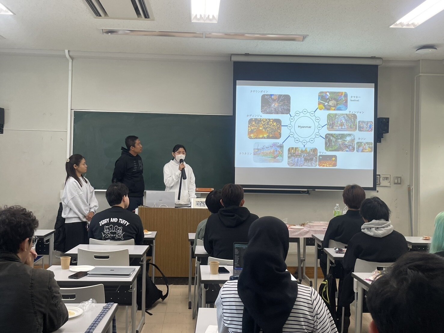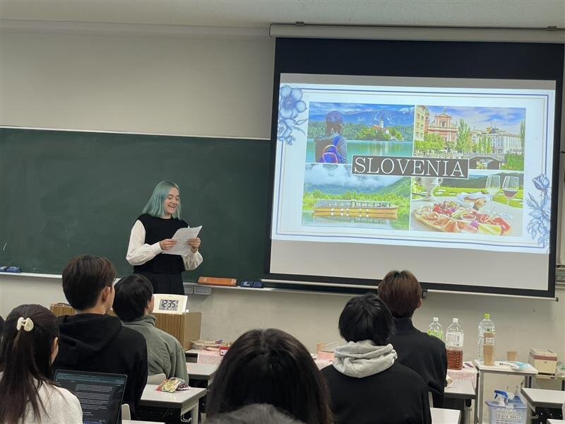 「中級日本語」の学生からは、韓国、ミャンマー、スロベニア、台湾、インドネシア、タイ出身の留学生がスライドを使い、