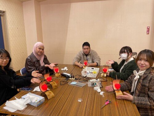 「小柴先生のおかげで、今日は地域創成学部の学生たちと一緒に西米良村に行きました。途中の景色はとてもきれいでしたが、山道に入ると車に酔って、吐きそうになりました。バスを降りたあと、地域創成学部の学生たちの発表を聞きました。台湾でも似たような授業を受けたことがあるので、とても面白いと思いました。その後、伝統料理を食べました。とてもおいしかったです。そして、手作り体験をしました。普段使わない物を作品にするところが、とても興味深いと感じました。最後に温泉に入り、とても気持ちよかったです。西米良村に触れる機会をくださり、小柴先生に感謝しています。」