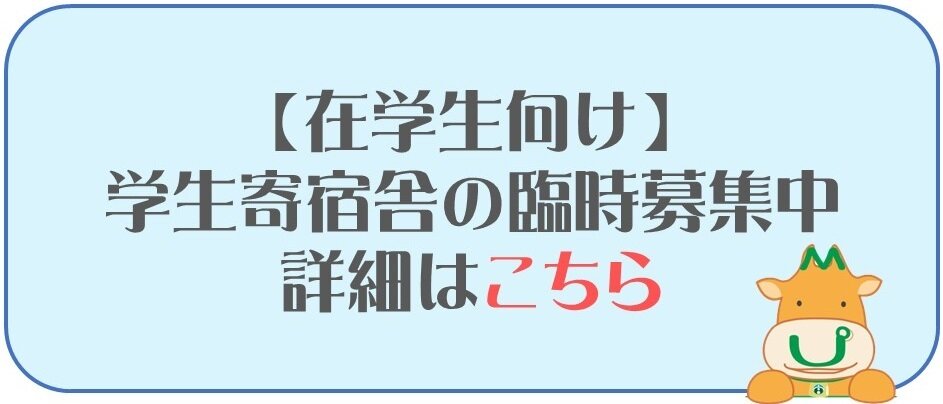 男子寄宿舎 | 日本人男子学生 | 7,000円 | 8,000円程度 | 全室個室、トイレ・バス等共同 | 男子寄宿舎・女子寄宿舎・国際交流宿舎概要 | |