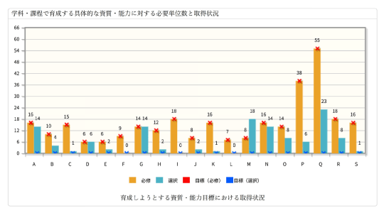 標準単位数に対して、必修・選択科目をどのペースで修得しているかを表示します。