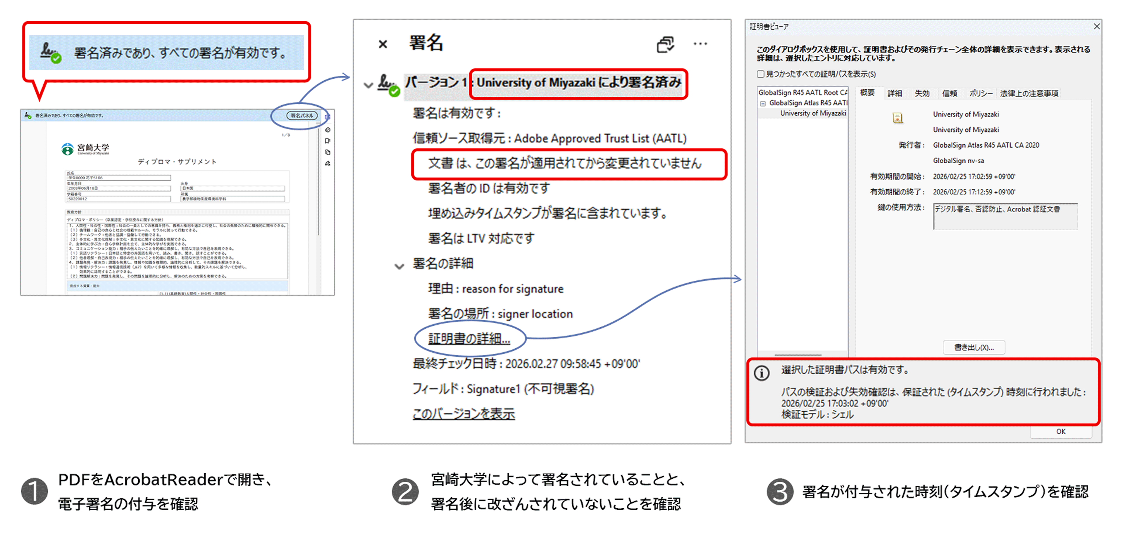 Readerを用いて本学の公式な証明書であることを確認できます。