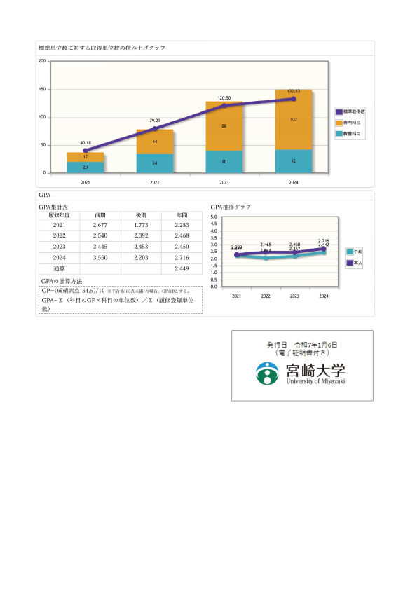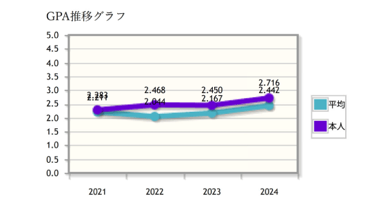 入学から卒業までの成績評価(GPA)の推移を一目で確認できます。