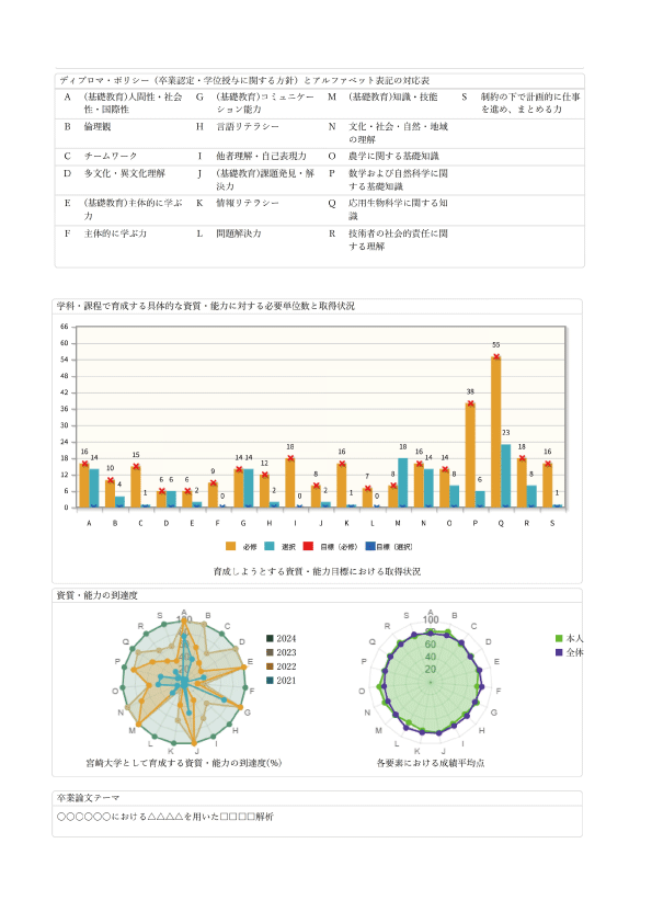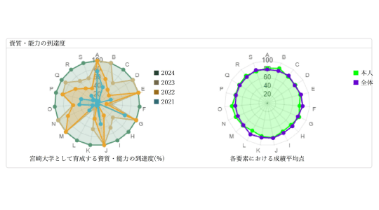 「主体的に学ぶ力」や「課題発見・解決力」など、各ポリシーに対するあなたの到達度を可視化します。