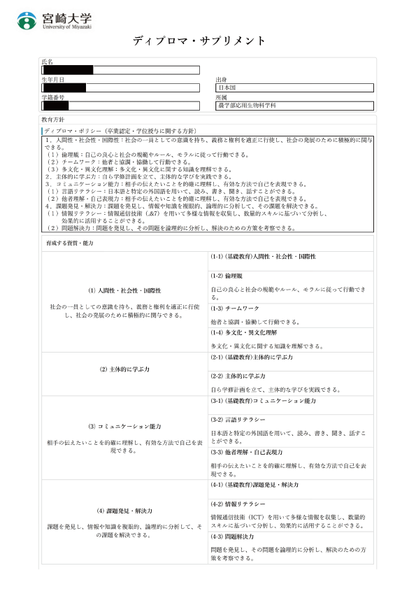 ディプロマ・サプリメントには、卒業認定・学位授与の方針(ディプロマ・ポリシー)に基づいた、以下の詳細な情報が記載されます。