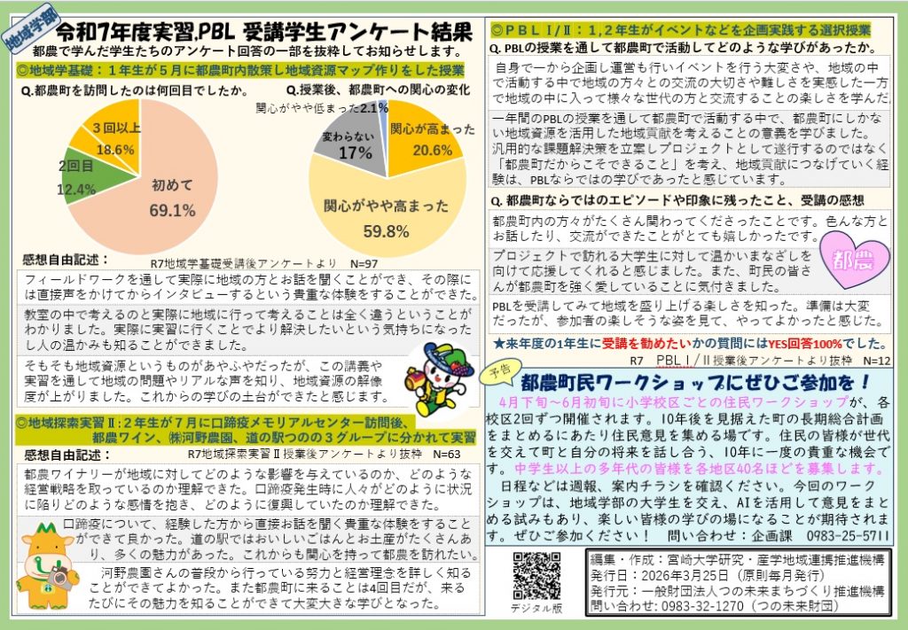 かわら版は原則毎月発行、宮崎大学から都農町寄附講座の今をお伝えします。