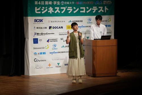 その後、一連のプログラムに参加した学生のうち、53名28組がコンテストにエントリーし、書類審査を突破した7組が決勝プレゼンテーションに進むことになりました。決勝プレゼンテーションでは、スマートフォンなどに残る人には見られたくないデータ(デジタル遺産)を自動消去できるアプリを開発して死後のプライバシーを守るプランや日本国内に約500万人いると想定される手掌多汗症に悩む人が少しでも快適に勉学などに集中できる製品を開発するプランなどの社会課題の解決を目指すビジネスプランを提案。最終的に、「ジオバクタープロジェクト ~運ばない電気でoffGRID農業~」を提案した宮崎大学農学部3年の山﨑愛美華さん、平田大空さんのコンビが最高賞となるグランプリに選ばれました。