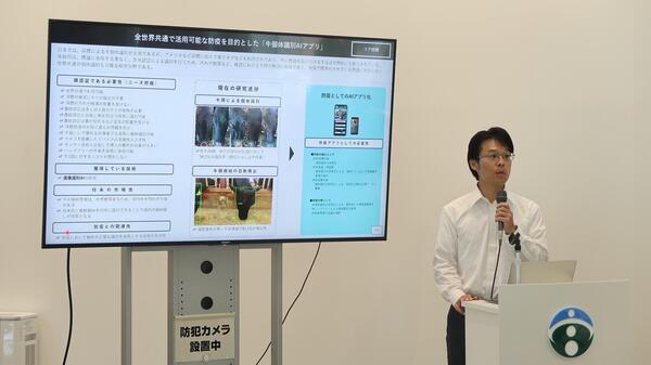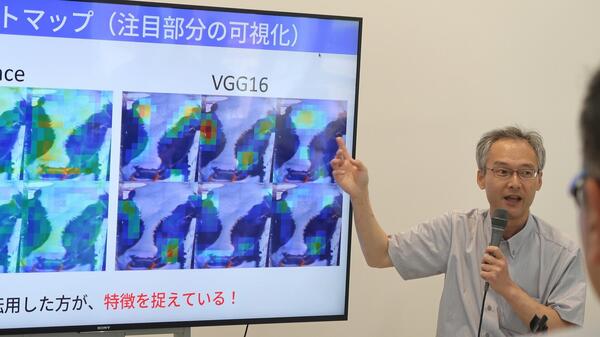 続いて、椋木雅之教授(工学部工学科情報通信工学プログラム)が、実際に「牛個体識別AIアプリ」を用いたデモンストレーションを行い、使い方などを説明。牛の個体識別は依然として目視による耳標番号の確認が主流であり、高齢化する畜産農家には大きな負担となっているが、AIによる顔認証技術が実用化されれば、家畜防疫や飼養衛生管理対策に大きく貢献し、今後の畜産業における生産のあり方を大きく変える可能性があることを説明しました。