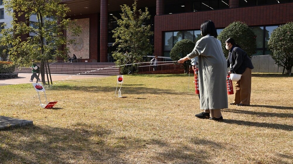 また、放水訓練や救護訓練が事務局棟で、消火器訓練や煙体験、地震体験車を利用した地震体験が創立330記念交流会館前で行われ、多くの学生と教職員が参加しました。