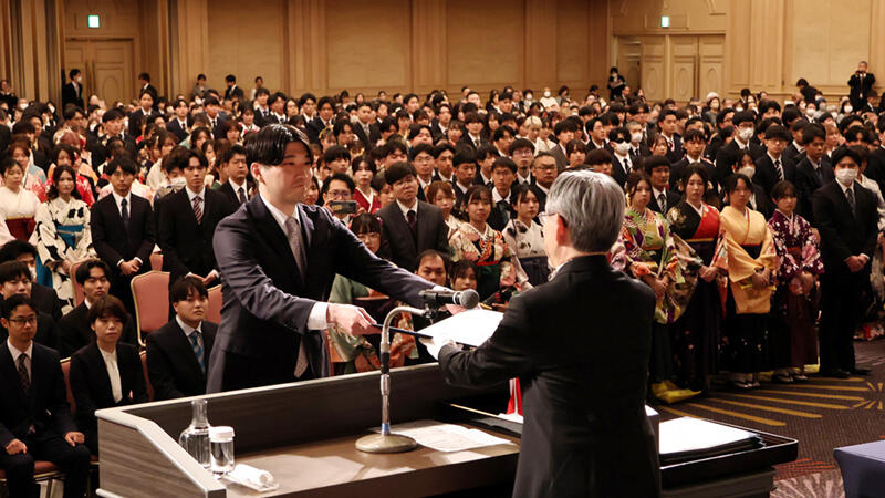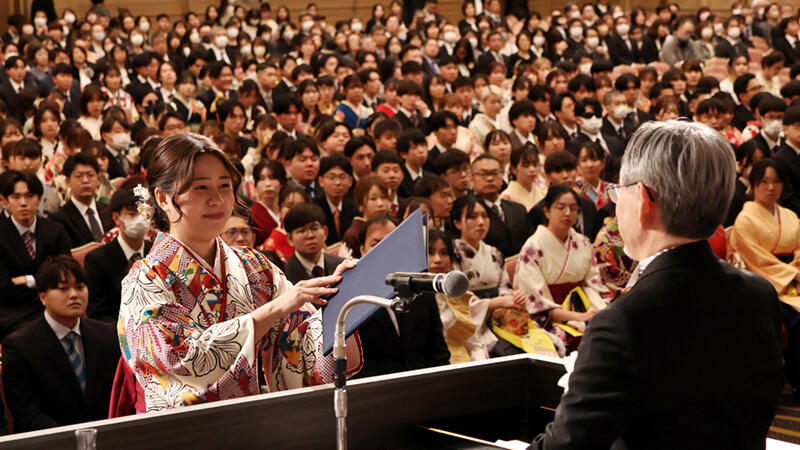 式では、学部卒業生を代表して、農学部の山村実央さんから、「入学当初は新型コロナウイルス流行のため、対面での活動が制限され、慣れないオンライン授業などに戸惑うこともありましたが、教職員の皆さま、そして家族や友人の支えのおかげで、恵まれた環境の中、充実した大学生活を送ることができたと実感しております。(中略)この4年間で培った挑戦する心、仲間と協力する姿勢、そして学び続ける姿勢を糧に、4月から始まる社会人生活においても成長を続けてまいります」と、謝意が述べられました。また、鮫島浩学長からは、環境問題・貧困問題、人口増加問題などの複雑かつ重要な地球規模の課題に対して、「自分事として捉え、自分の専門性の中で、世界市民としての視点を持ち、できることから始め、世の中に貢献してください」、というメッセージが学生に贈られました。
