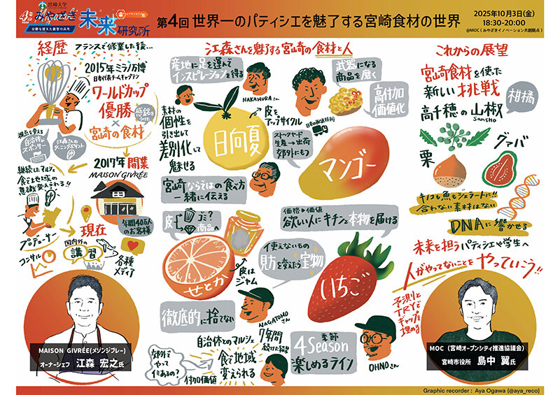 2025年10月3日(金)、メゾンジブレー オーナーシェフ 江森宏之(えもり ひろゆき)氏をゲスト講師にお迎えし、2025年度(令和7年度)第4回みやざき未来研究所(テーマ:「世界一のパティシエを魅了する宮崎食材の世界」)が宮崎オープンシティ推進協議会(MOC)との共催で開催され、約60名のみなさまにご参加いただきました。