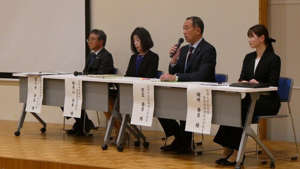フォーラムでは、まずコース長の盛満弥生准教授が10年間の取組を紹介しました。続いて、同コースの卒業生である現職教員3名による実践報告、学部2年生による活動報告が行われ、入試や教員養成プログラムに協力してきた宮崎県教育委員会や小学校長等の先生方を交えたパネルディスカッションが行われました。
