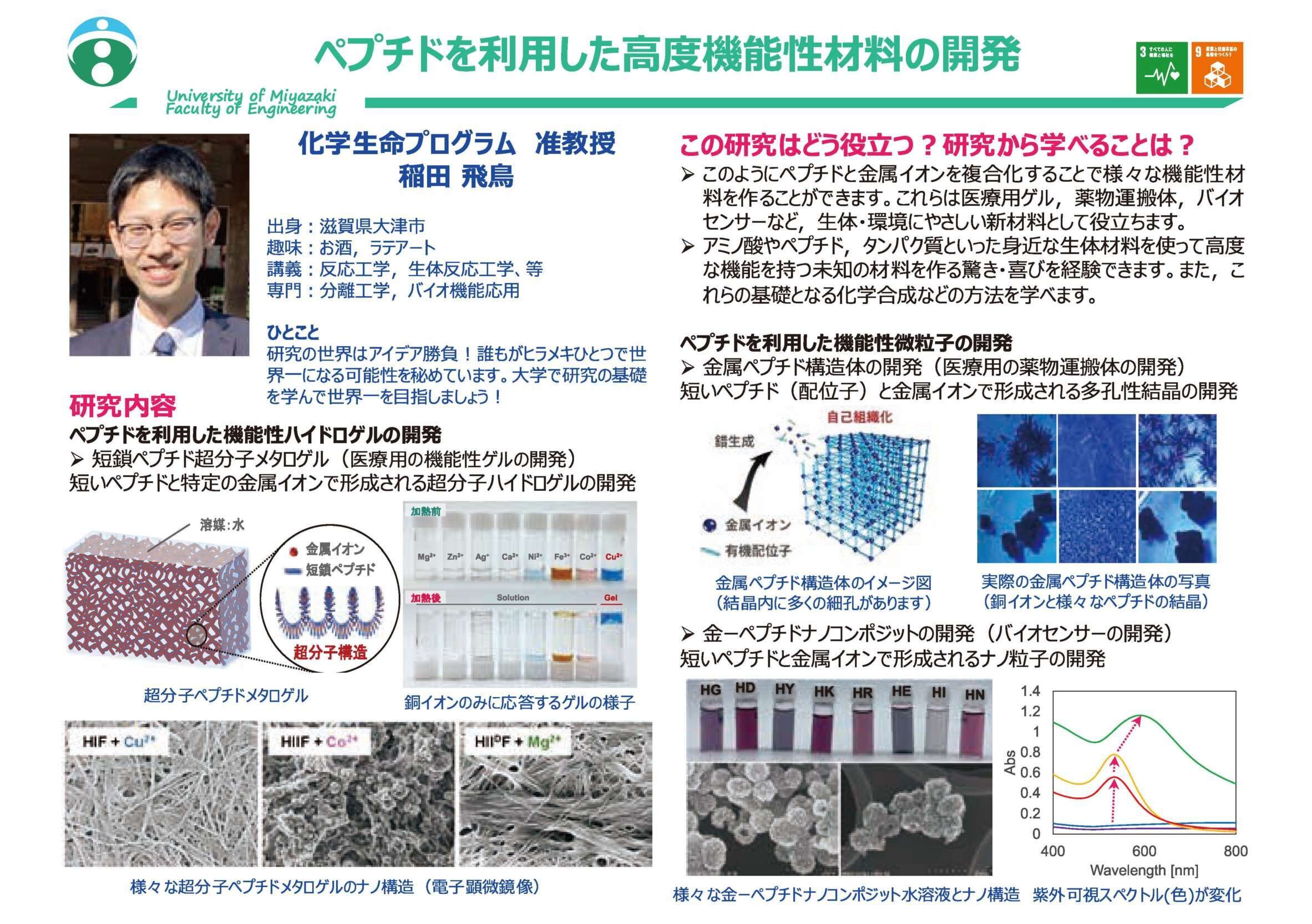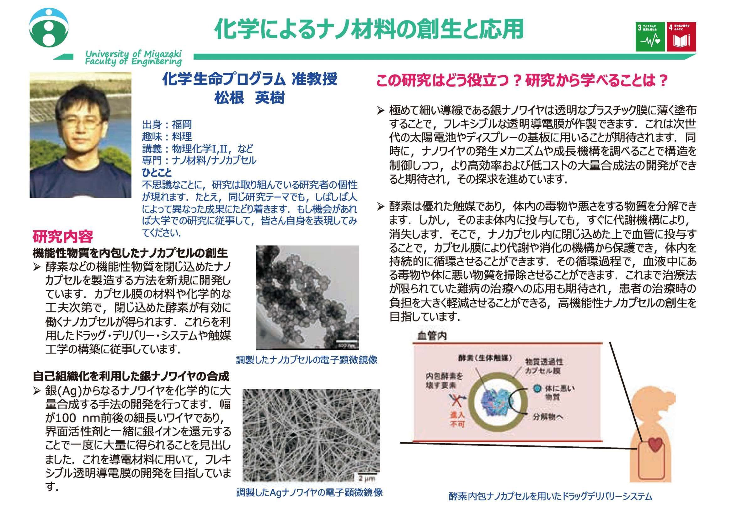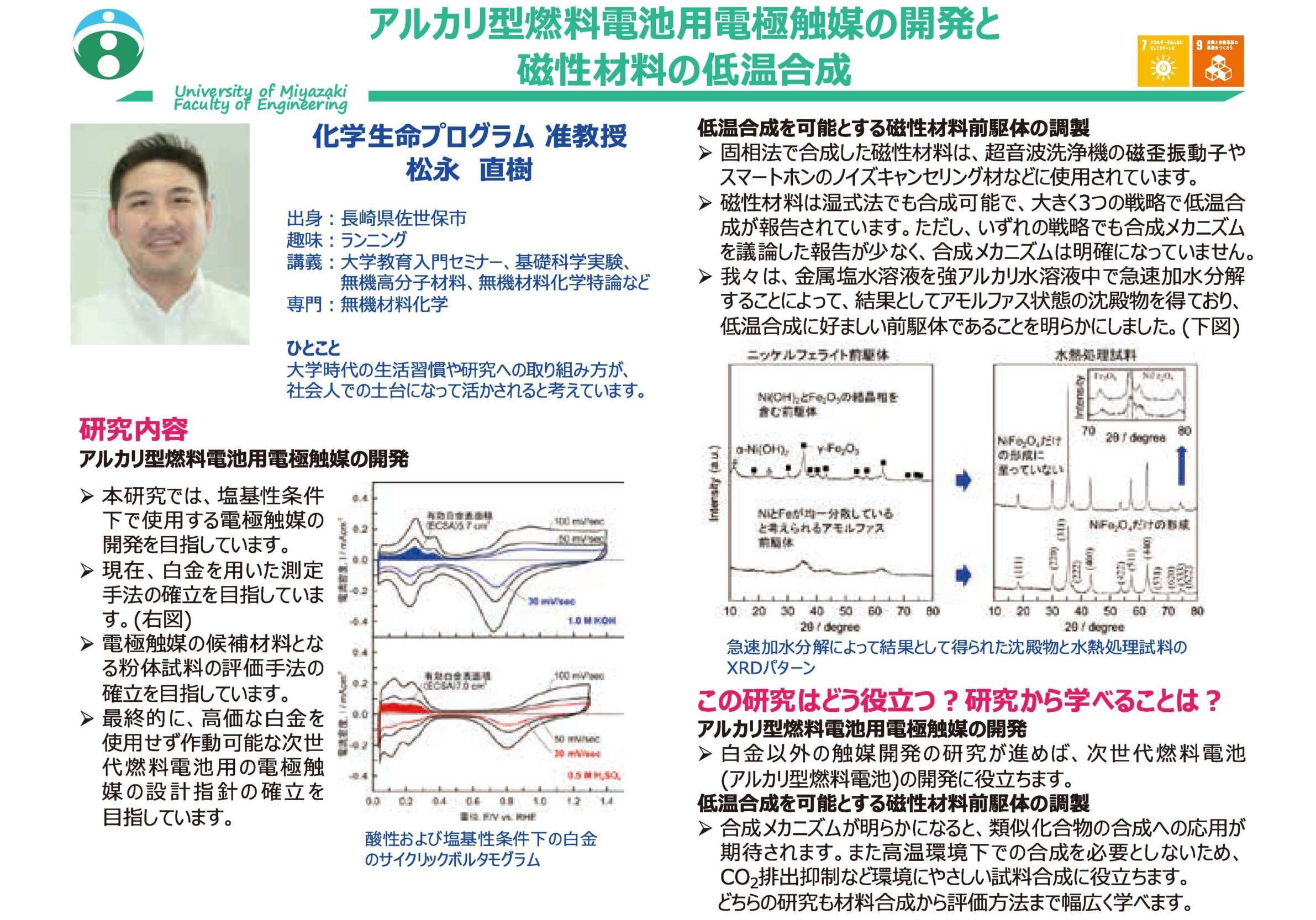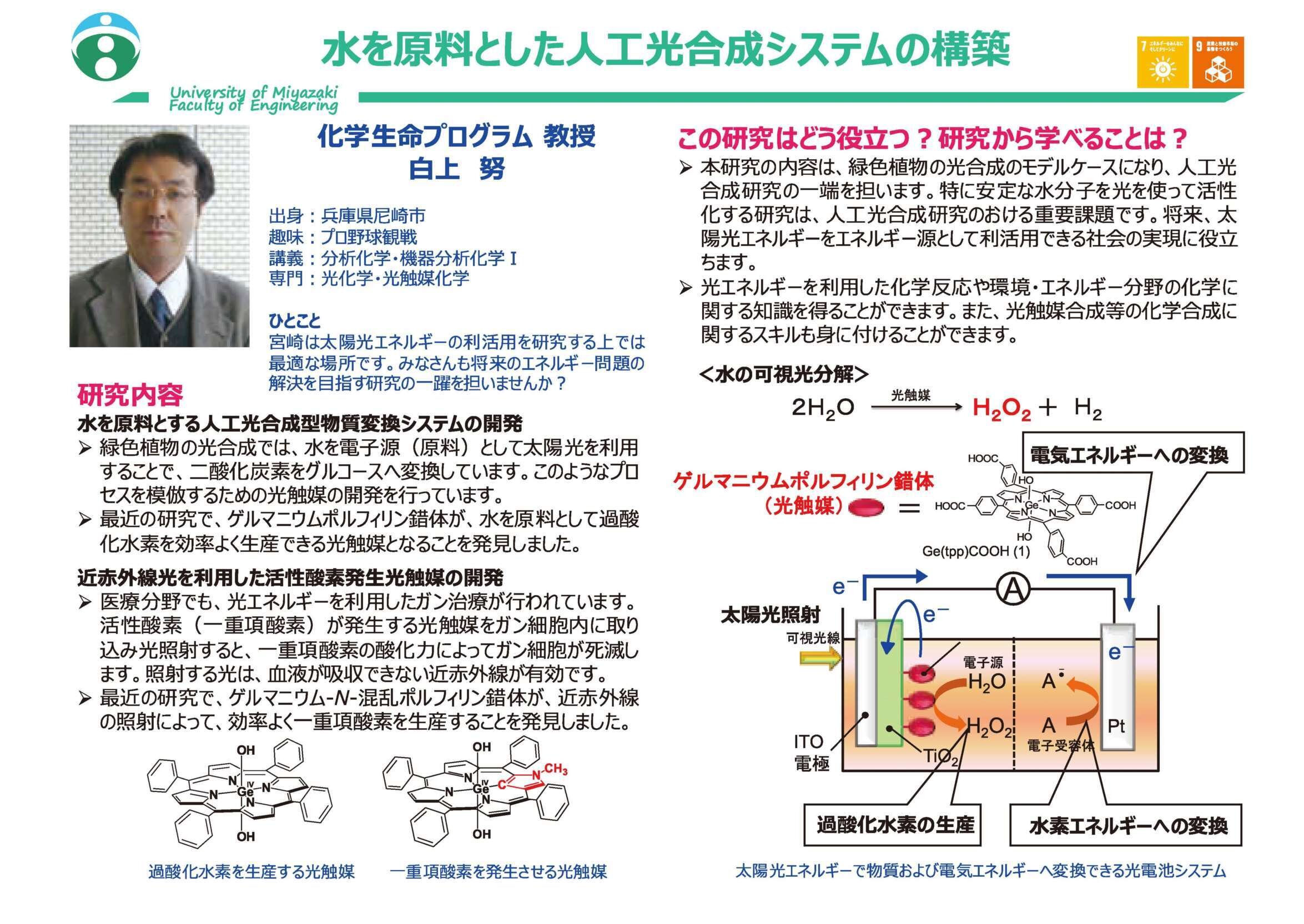 すべて 化学生命プログラム 土木環境プログラム 半導体サイエンスプログラム 電気電子システムプログラム 機械知能プログラム 情報通信プログラム 工学基礎教育センター 化学生命プログラム 稲田 飛鳥 化学生命プログラム 2025.10.01 ペプチドを利用した高度機能性材料の開発 研究の世界はアイデア勝負!誰もがヒラメキひとつで世界一になる可能性を秘めています。大学で研究の基礎を学んで世界一を目指しましょう! 化学生命プログラム 井澤 浩則 化学生命プログラム 2025.10.01 地球環境にやさしい高分子材料をつくる バイオマス資源から高分子材料をつくる研究を行っています。研究を通して地球環境や人々の建康に貢献したいと考えています。 化学生命プログラム 大島 達也 化学生命プログラム 2025.10.01 溶かす・溶かさぬで世の中をより良く 私は自称、「溶かす」の専門家です。分離技術の世界では、特定の物質だけ溶かしだしたり、溶かさないことで物質を分離できます。医薬品や栄養素を処方しやすくし、治療に役立てられます。研究室の卒業生は、金属精錬、ファインケミカル、食品、医薬品業界など多様なものづくり分野に就職しています。 化学生命プログラム 奥山 勇治 化学生命プログラム 2025.10.01 水素エネルギー社会を目指した次世代燃料電池・水素製造デバイスの開発 何かに‘‘徹する”ことが重要だと思っています。失敗を恐れずにいろいろなことにチャレンジすると共にその一つ一つを全力で取り組んでみてください。きっとオンリーワンのものが見つかると思います。 化学生命プログラム 酒井 剛 化学生命プログラム 2025.10.01 エネルギー・環境関連材料の開発と高性能化 エネルギー変換材料やエネルギー貯蔵材料は、今後ますます必要とされ発展する分野ですが、材料そのものも奥深くて面白いし、自分で創れるところが魅力です。 化学生命プログラム 白上 努 化学生命プログラム 2025.10.01 水を原料とした人工光合成システムの構築 宮崎は太陽光エネルギーの利活用を研究する上では最適な場所です。みなさんも将来のエネルギー問題の解決を目指す研究の一躍を担いませんか? 化学生命プログラム 宇都 卓也 化学生命プログラム 2025.10.01 分子シミュレーションが開拓する次世代型モノづくり 近年さらなる進歩を遂げた情報技術の活用で、次世代型モノづくりを実現し、新たな価値を創造していきます。 最先端の分子シミュレーションにより、モノづくりのデジタル変革(DX)技術を開拓することに挑戦してみませんか? 化学生命プログラム 菅本 和寛 化学生命プログラム 2025.10.01 植物は有機化学の宝箱 なぜ?を追求するのが大学と思っています。大学の講義は暗記ではなく理解です。大学の研究もなぜ?を考えるのが重要です。ぜひ一緒になぜ?を追求しましょう。 化学生命プログラム 鍋谷 悠 化学生命プログラム 2025.10.01 ナノシートに分子を並べて機能を発現させる新材料 研究には様々な分野があり、試してみないと分からないことが多いです。幅広い経験を積んで、皆さんがおもしろい!楽しい!と感じるものを見つけてください。 化学生命プログラム 廣瀬 遵 化学生命プログラム 2025.10.01 SDGsの達成に向けた微生物のゲノム解析 生命科学は、特に発展が著しい分野です。また、環境問題は人類の喫緊の課題です。 生物の優れた機能を利用して持続可能な開発目標(SDGs)の達成に取り組みましょう。 化学生命プログラム 松永 直樹 化学生命プログラム 2025.10.01 アルカリ型燃料電池用電極触媒の開発と磁性材料の低温合成 大学時代の生活習慣や研究への取り組み方が、社会人での土台になって活かされると考えています。 化学生命プログラム 松根 英樹 化学生命プログラム 2025.10.01 化学によるナノ材料の創生と応用 不思議なことに、研究は取り組んでいる研究者の個性が現れます。たとえ、同じ研究テーマでも、しばしば人によって異なった成果にたどり着きます。もし機会があれば大学での研究に従事して、皆さん自身を表現してみてください。 1 2 TOPに戻る