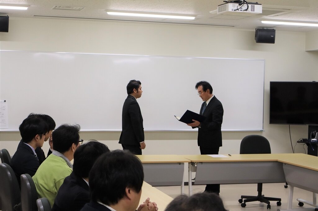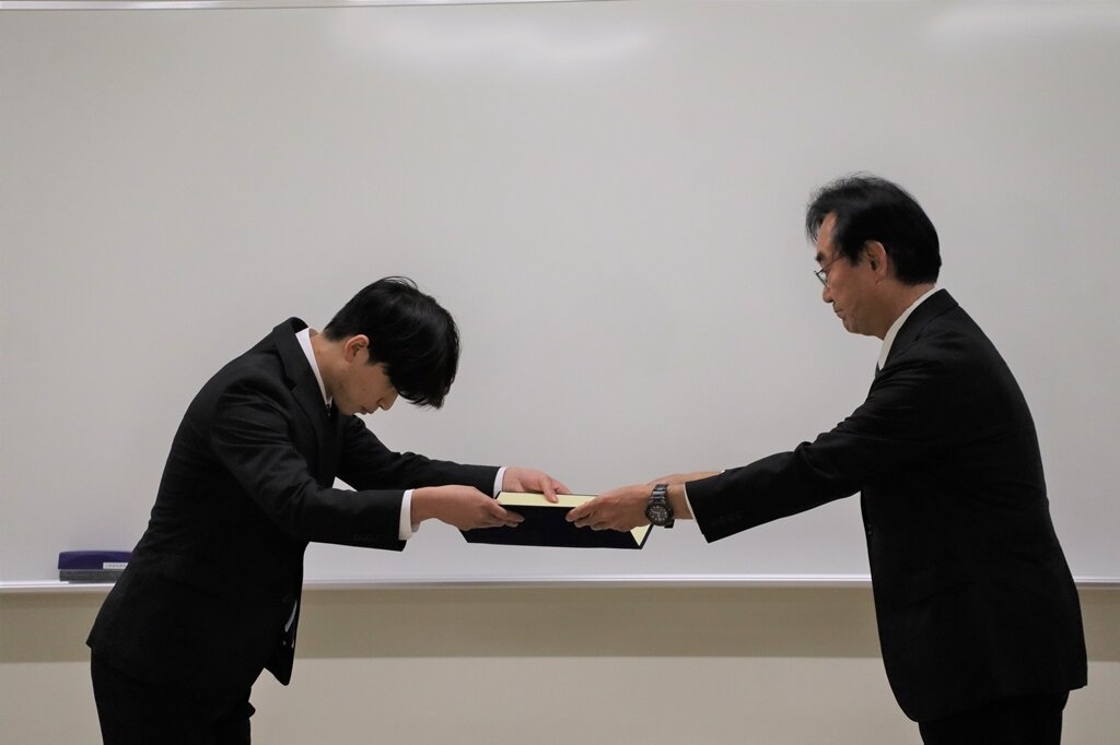 表彰式では、鈴木 祥広工学部長・工学研究科長から各受賞者に表彰状が授与され、学生表彰制度の趣旨と激励のお言葉を述べられました。