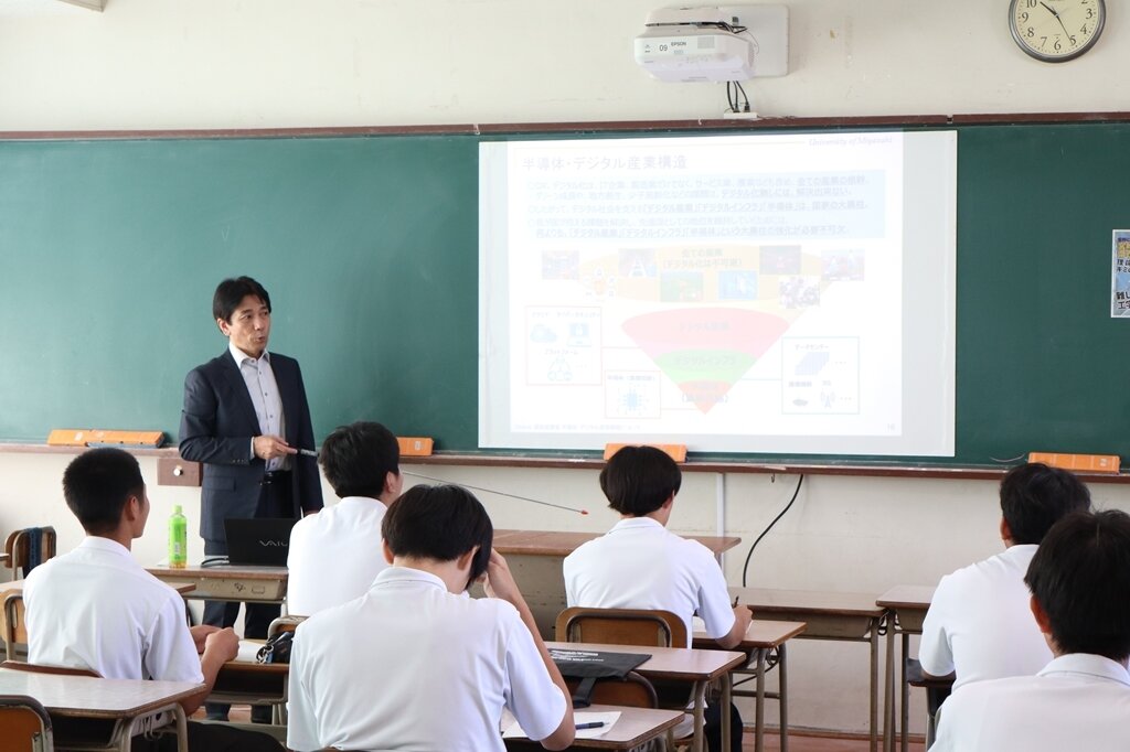 まず全体説明では、本学工学部の半導体サイエンスプログラムの福山 敦彦教授より宮崎大学の学部やプログラムの特徴、カリキュラムや魅力等について説明を行いました。
