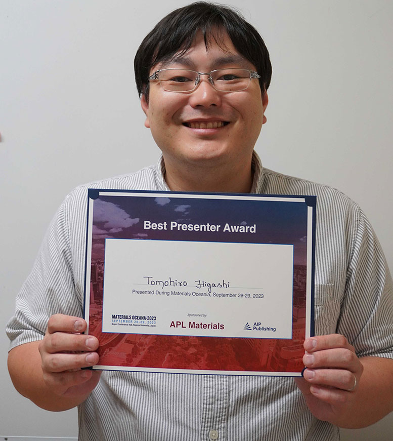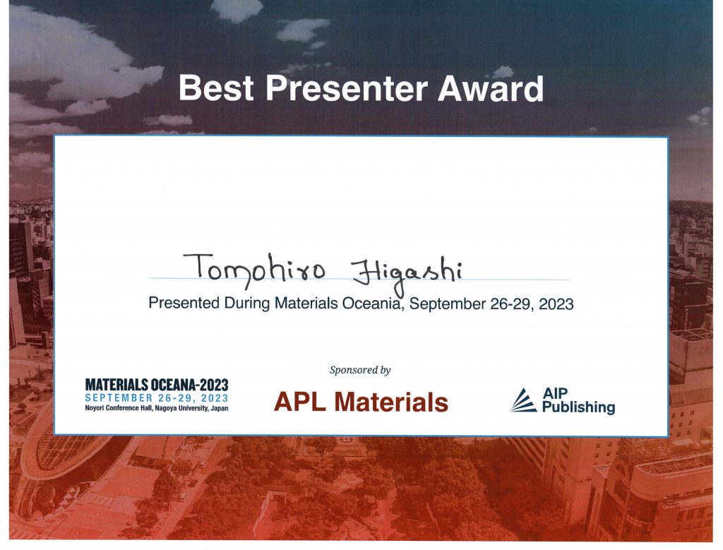 東TT助教が、2023年9月26日から9月29日に開催されたMATERIALS OCEANA2023で BEST PRESENTER AWARD を受賞しました。